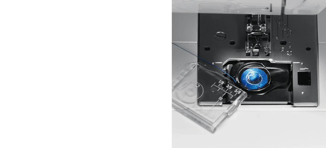 Med dette systemet kan spolen enkelt settes inn og trådtilførselen er alltid under kontroll! (På elna 3210 designet for jeans).